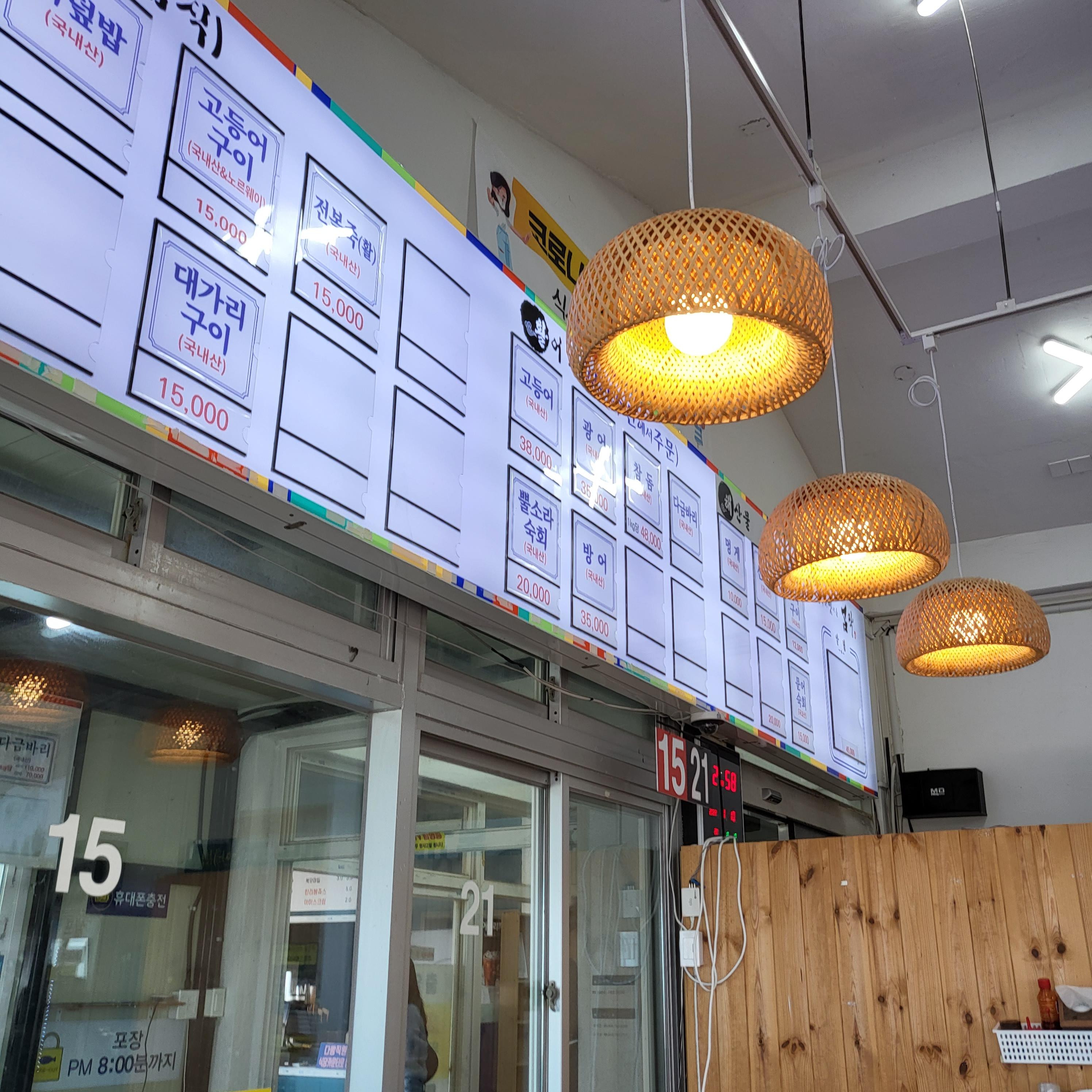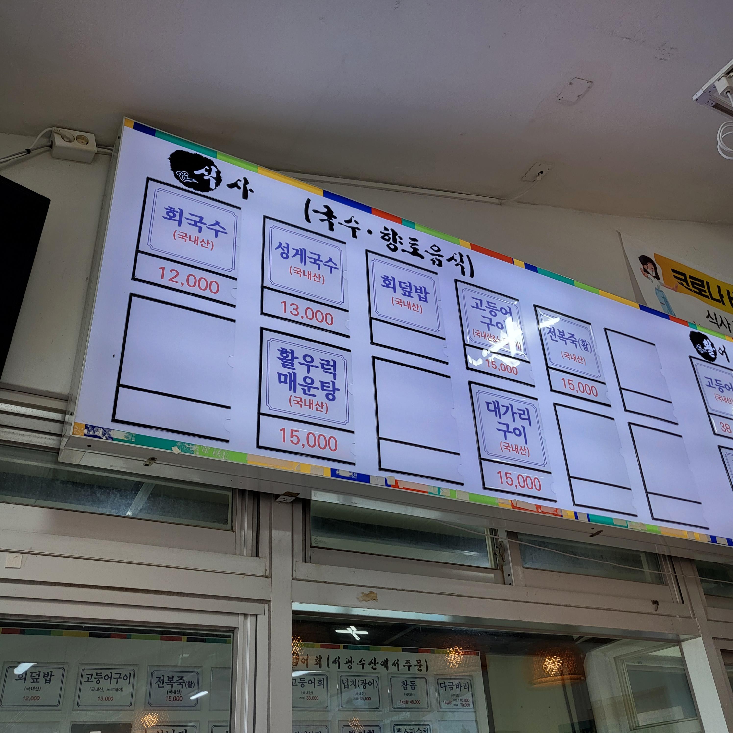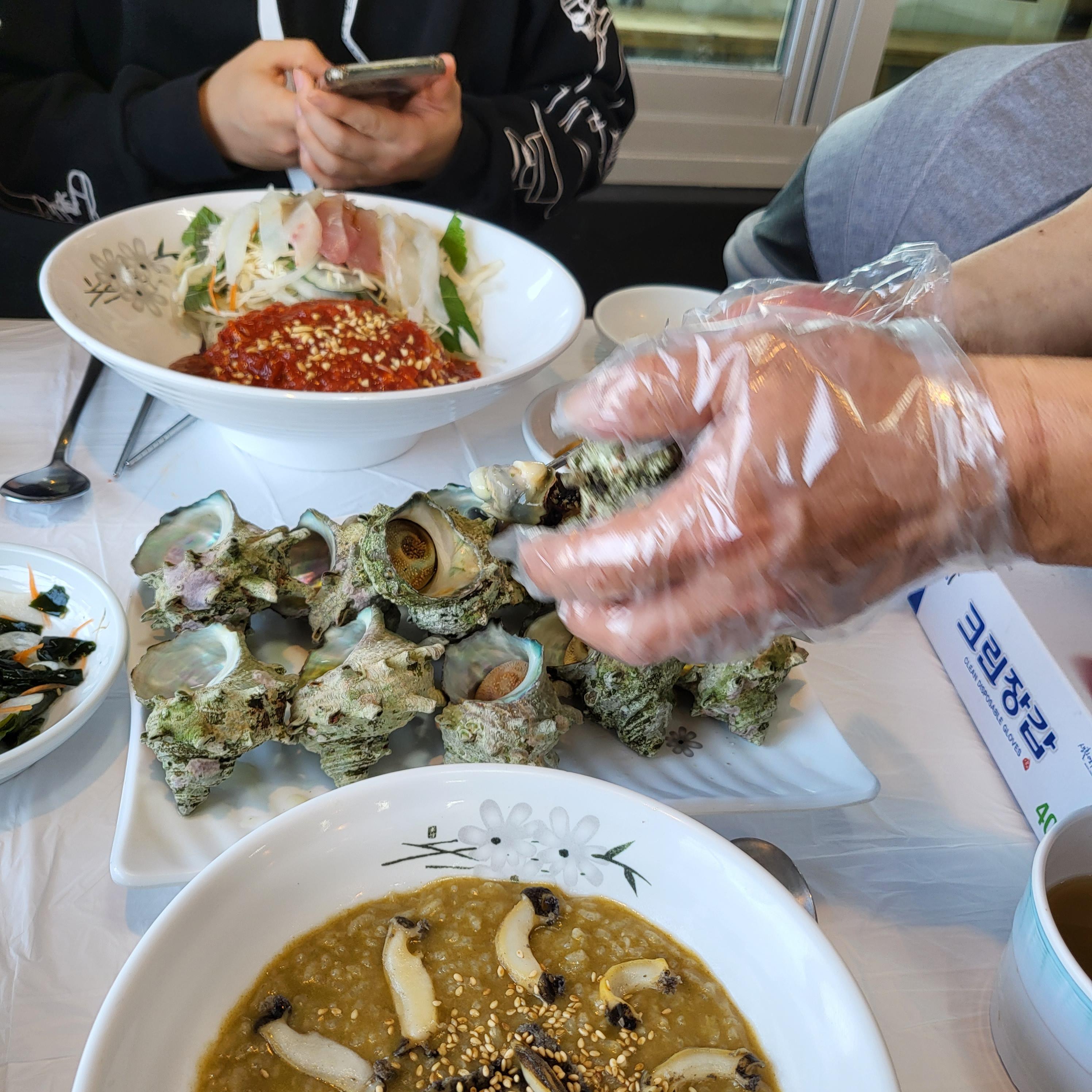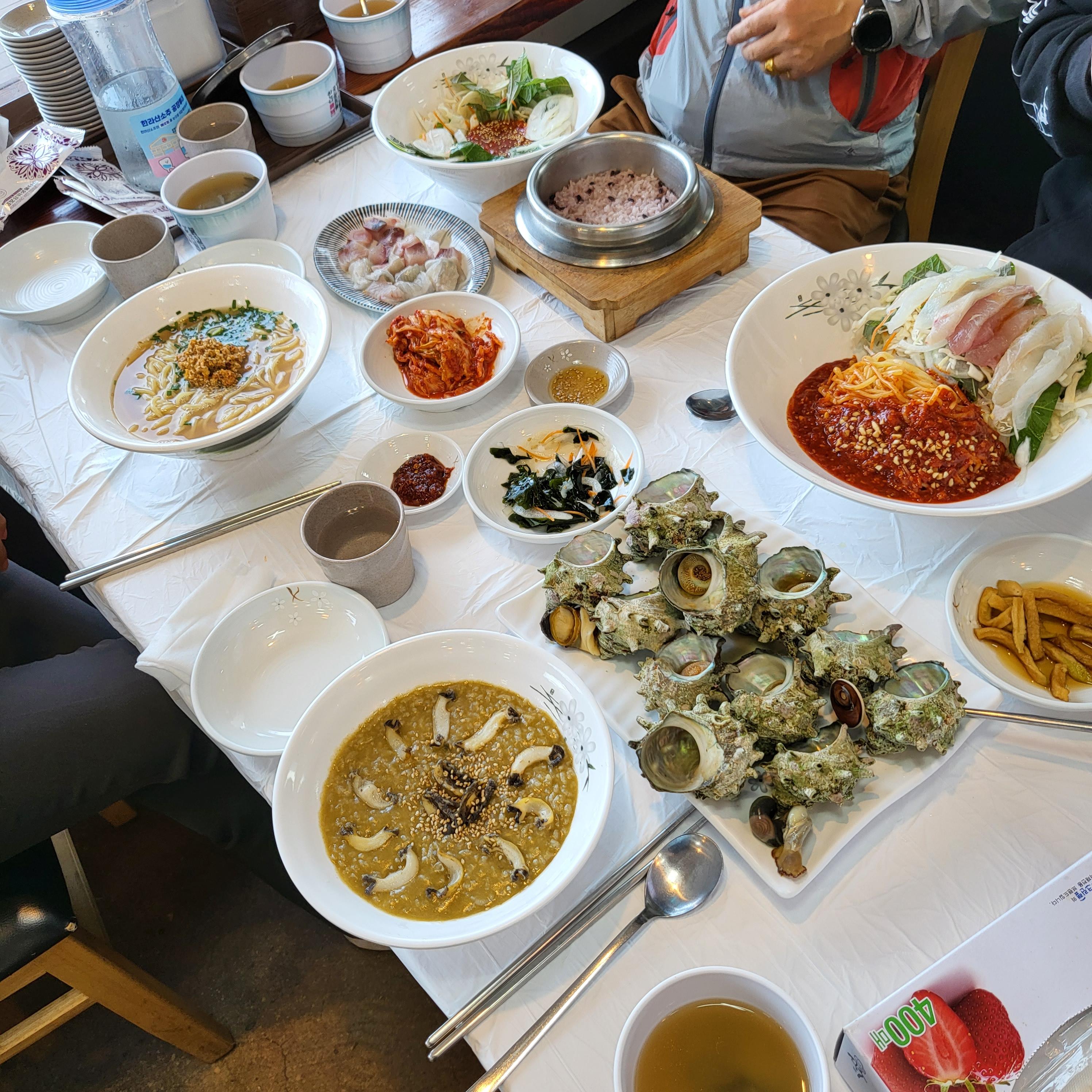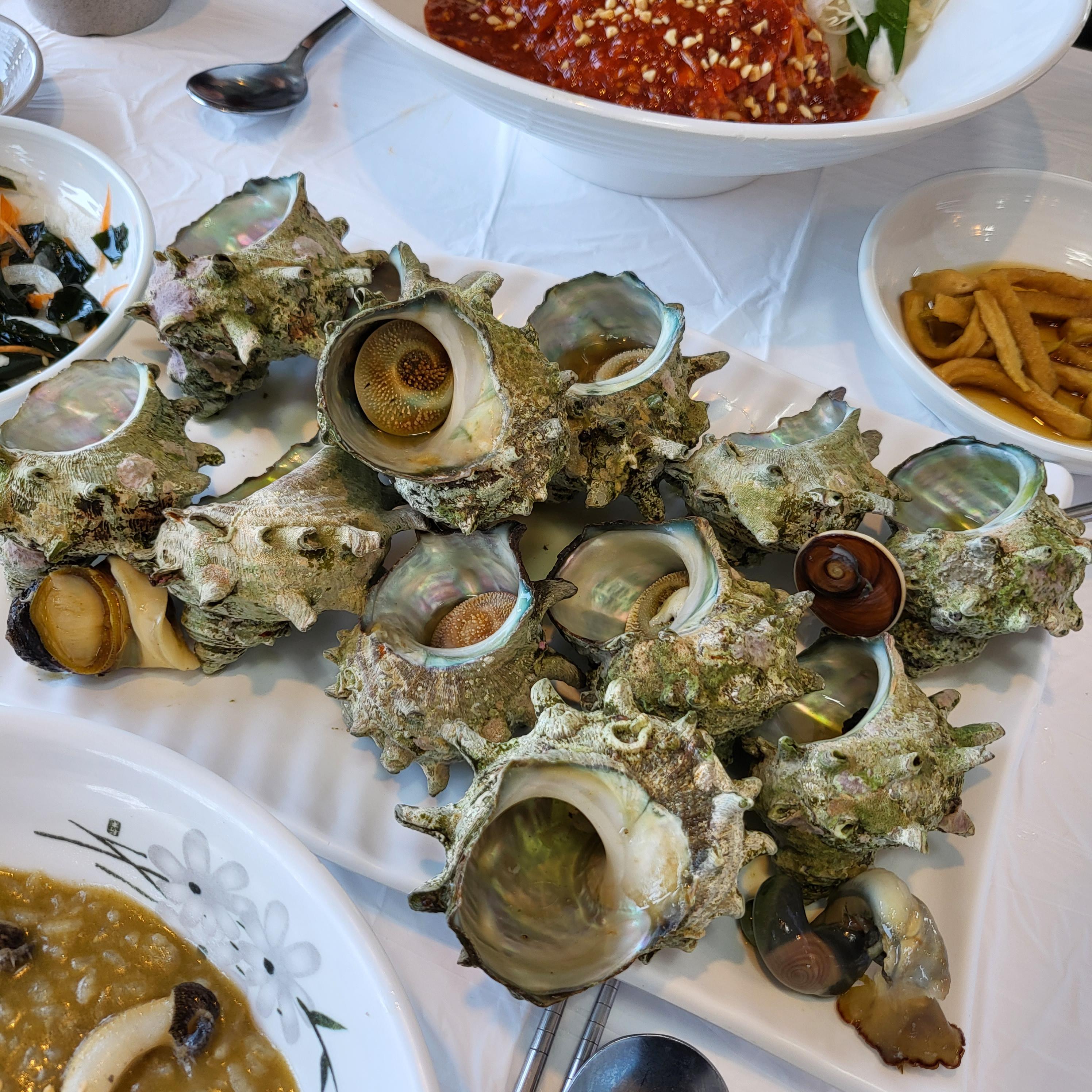 우리는 뿔소라 숙회, 회덮밥, 회국수, 성게국수, 전복죽 이렇게 5개 시켰다.