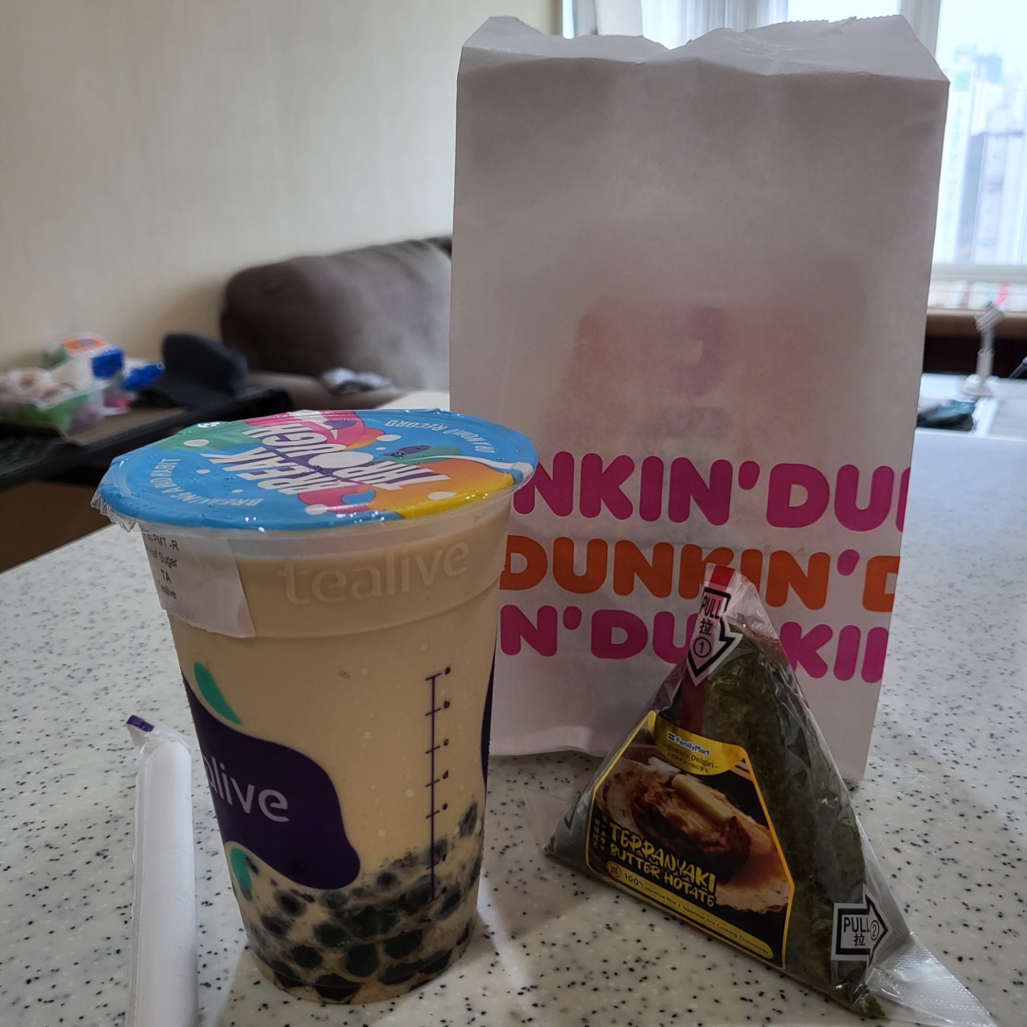그랩카 5링깃 바우처 2개, 라자다 5링깃 바우처 1개, 그리고 티라이브, 던킨 도너츠, 패밀리마트 삼각김밥으로 싹 바꾸고 0.78링깃 남김!
