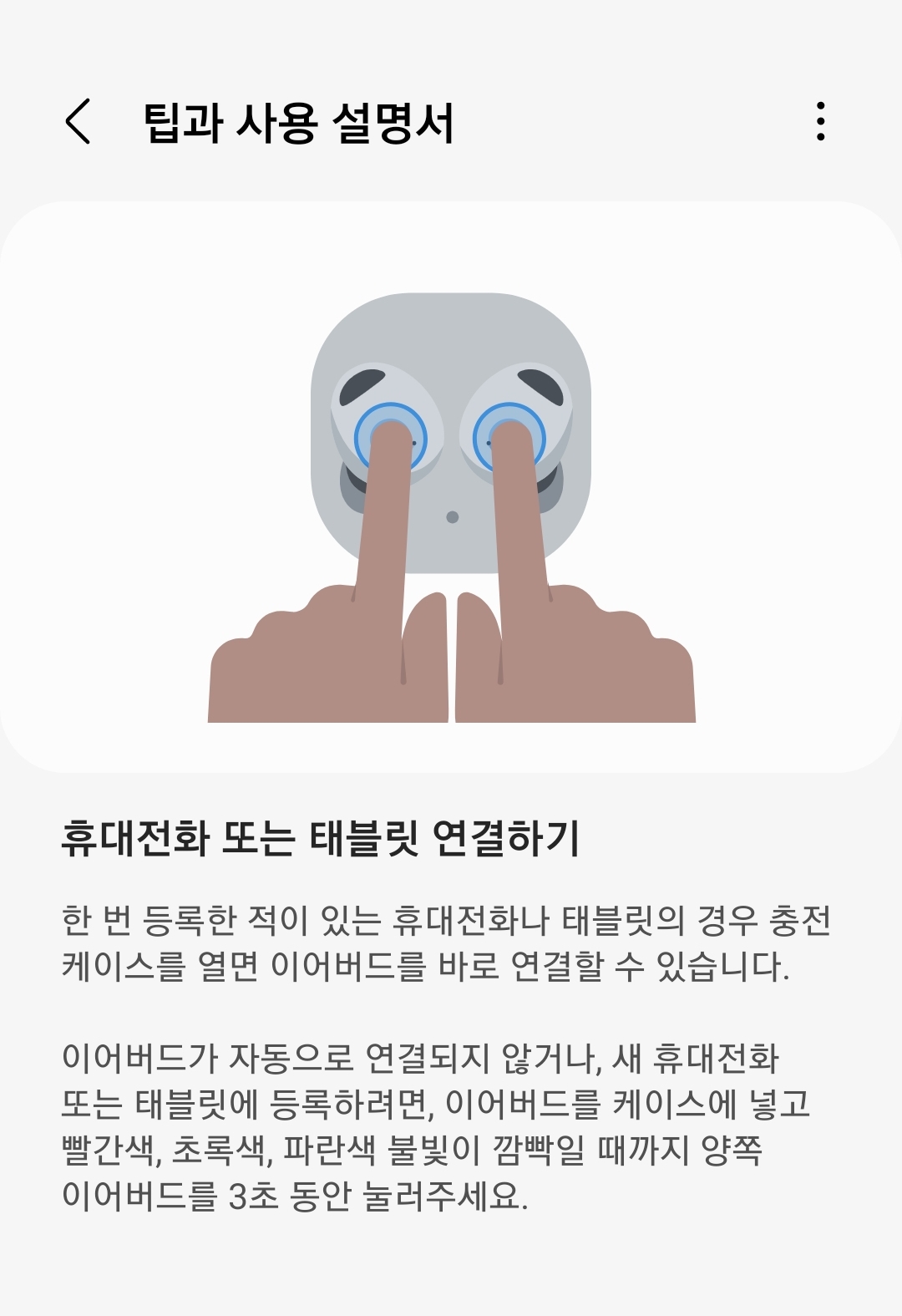 다른 기기와의 연결이 필요하면, 버즈를 케이스에 넣은 상태에서 두 손가락으로 양쪽을 꾸욱 눌러주면 된다.