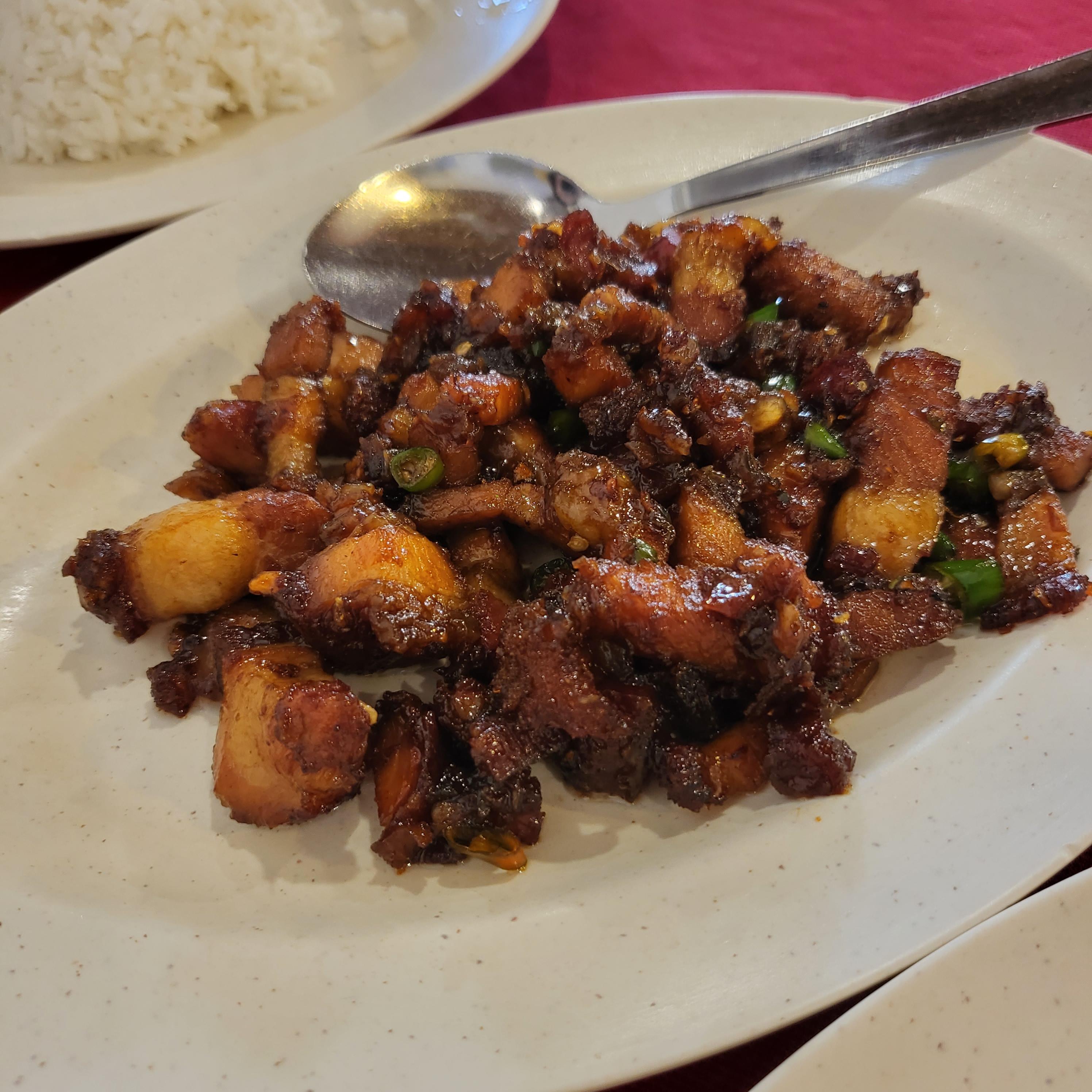 B는 Home receipe doulbe roasted pork with chili padi 이 메뉴가 맛있었다고 했다.