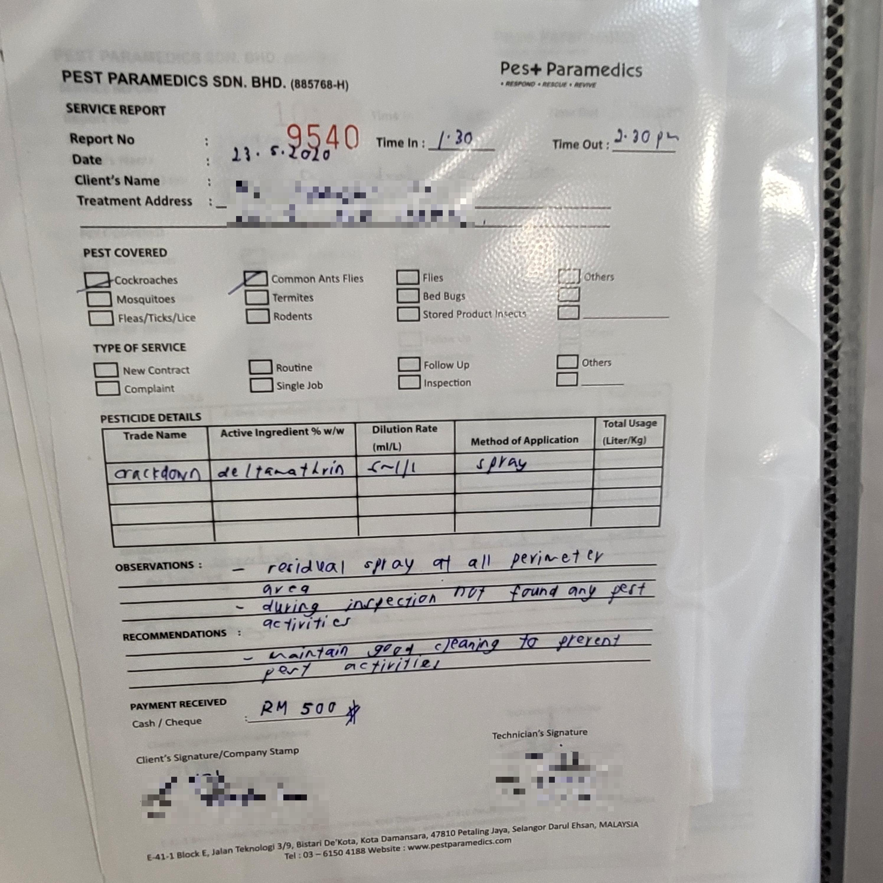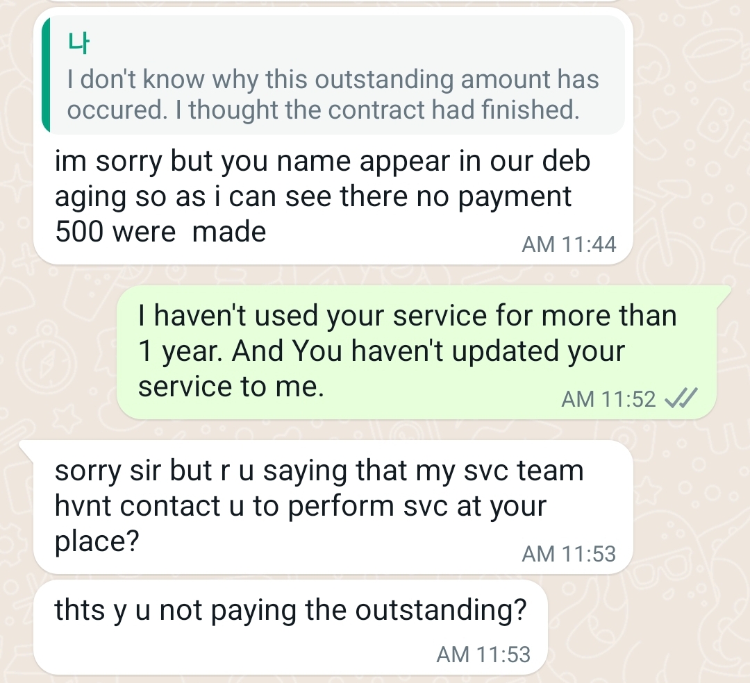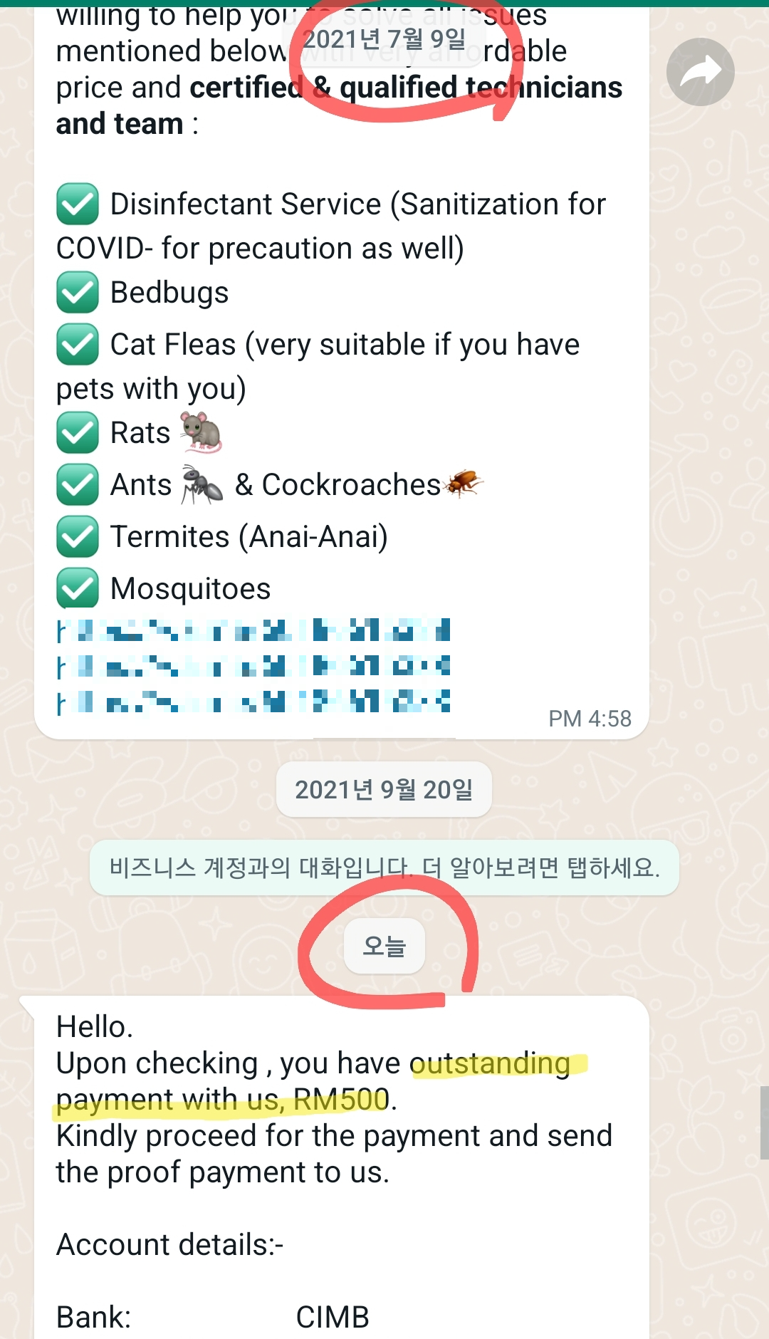 이 업체는 내가 2020년에 6번 방문방역하는 서비스로 Kaodim(지금은 망한 서비스 중개앱)을 통해 연락하여 약 1년간 이용한 적이 있다. 그리고 그 뒤는 추가로 더 이용하지 않아서 연락이 두절되었었는데, 갑자기 500링깃을 내라니...?
