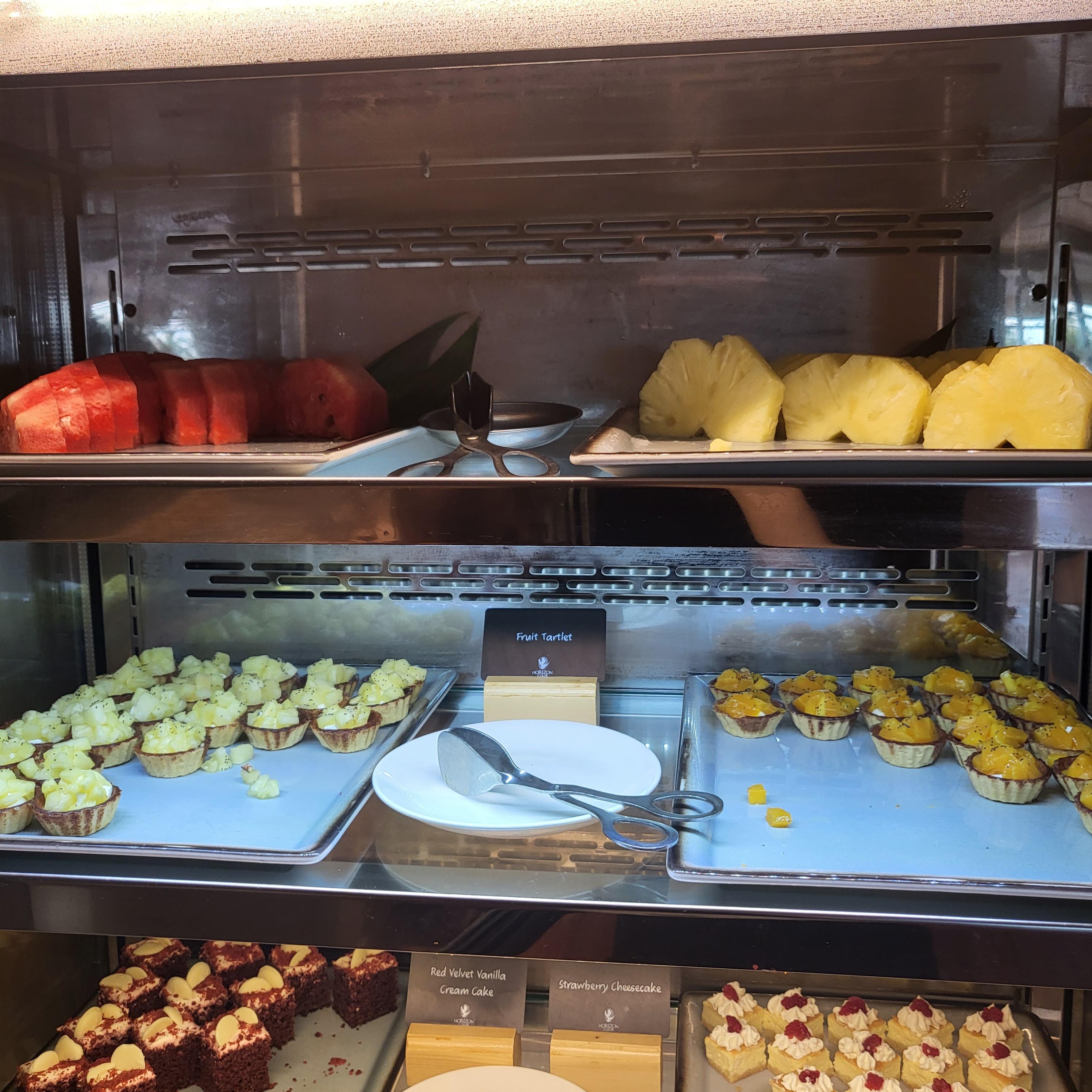 과일로는 수박/파파야, 패스츄리로는 초콜릿레이어케이크/견과류 타르트, 그리고 훈제닭을 얹은 빵