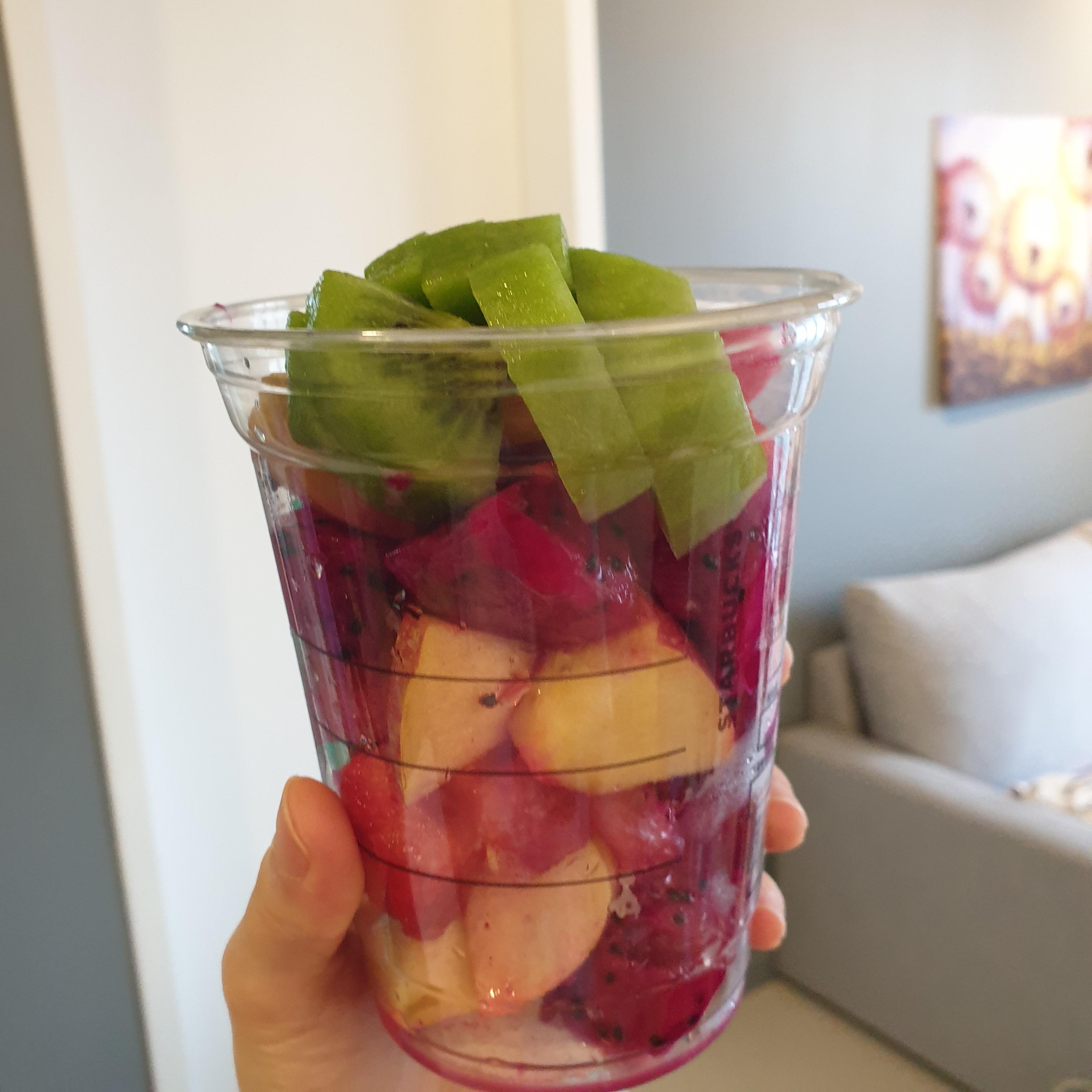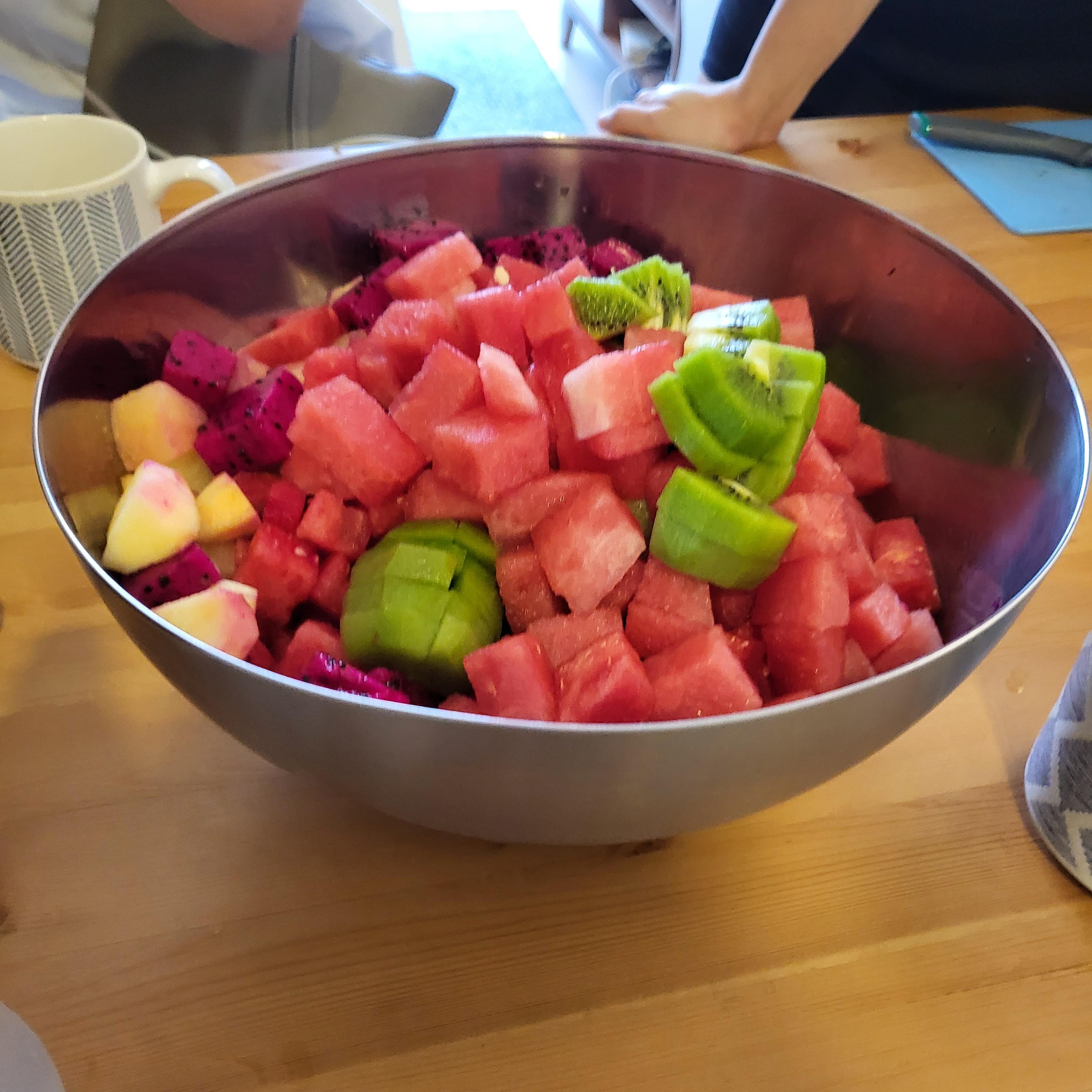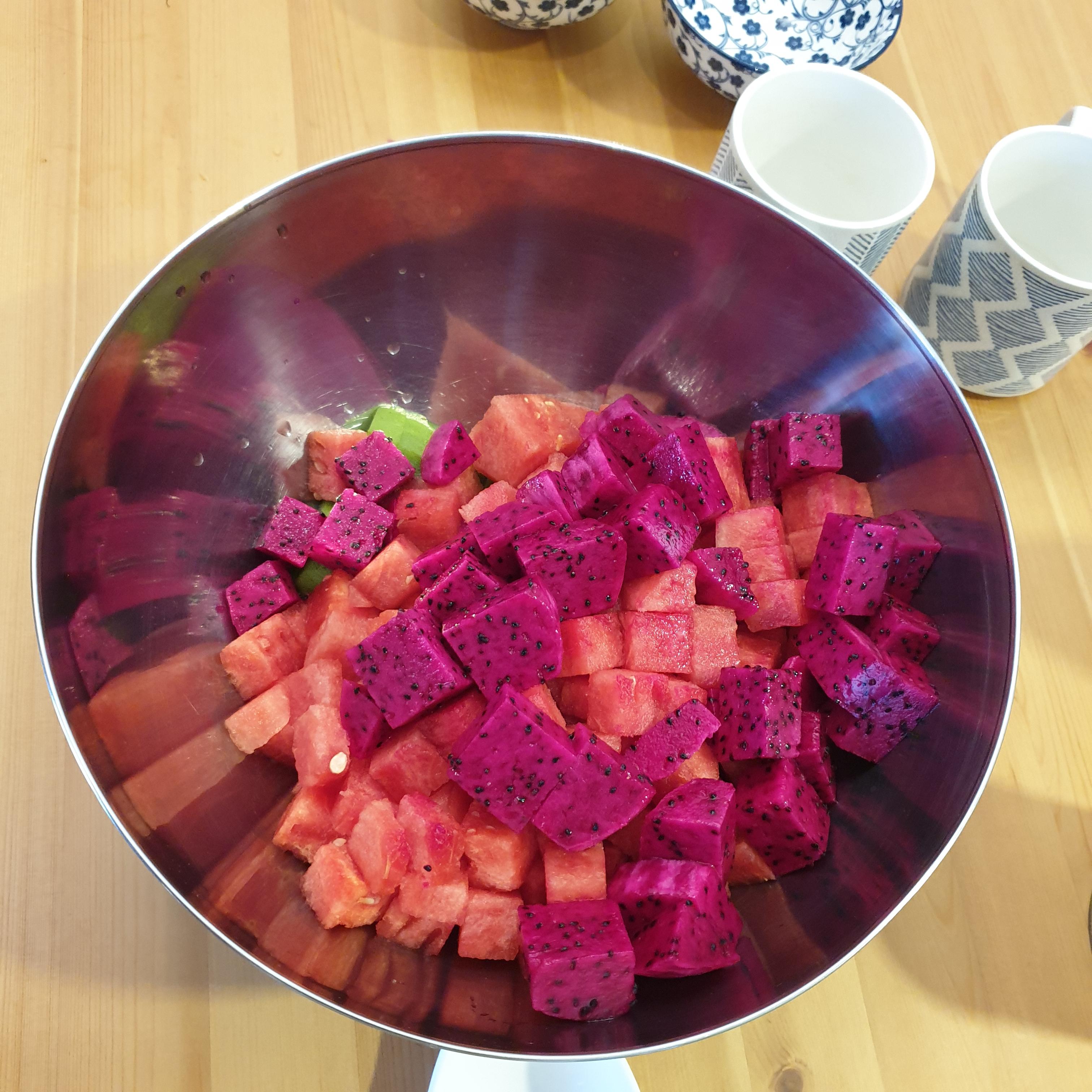 편안해진 마음으로 과일을 마저 다 썰어 넣었다. (남긴 건 통조림 파인애플 절반과, 용과 절반)