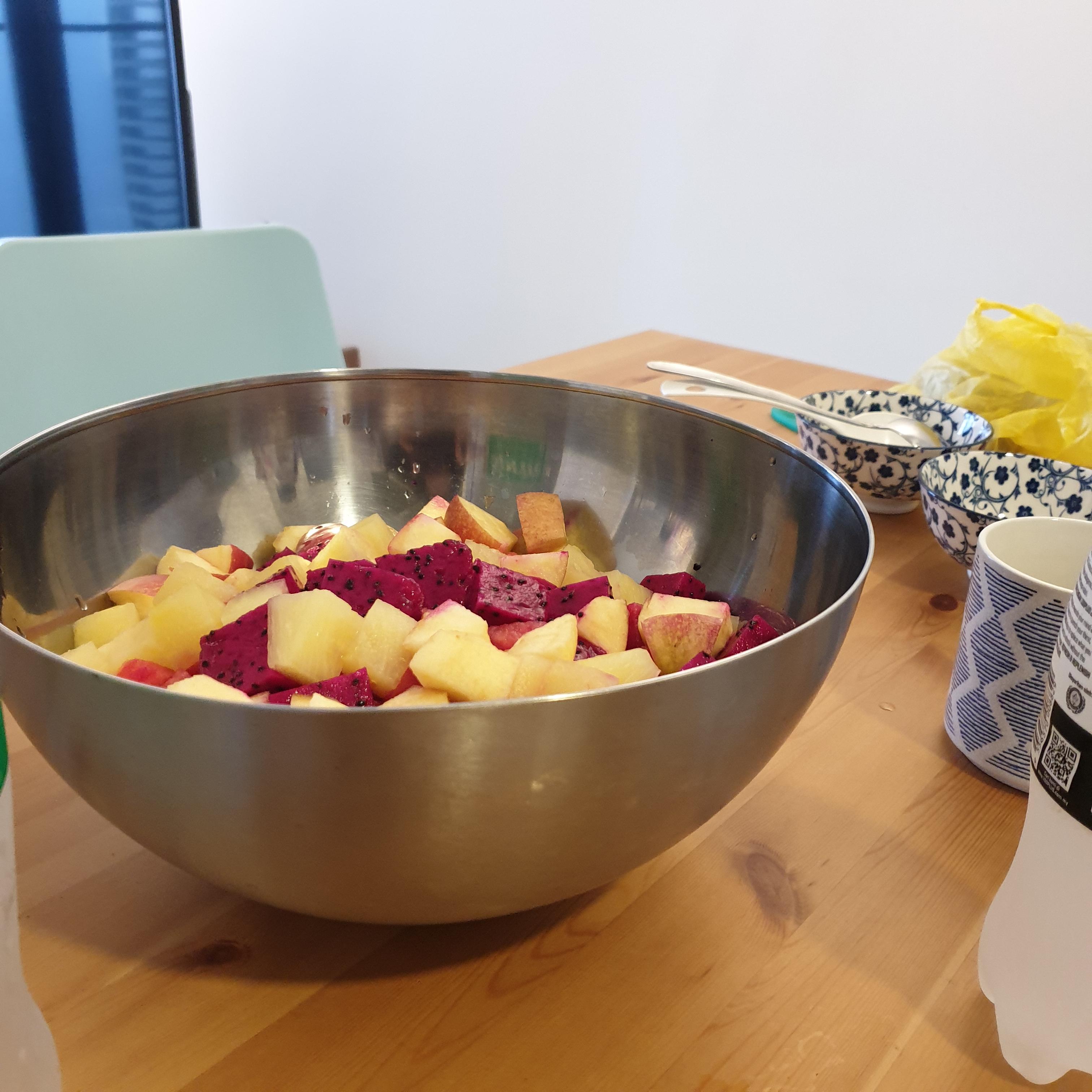 집주인이 사과 1개를 기부해 주셨고, 통조림 파인애플도 절반만 넣고 좀 더 썰어 넣었는데 이렇게 되었다.